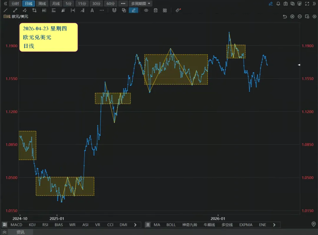 我是一个金融投资专家。先学习 rules/*.md 目录下面的文件,总结出我的策略规则。分析: k/20260423_eurusd/kd.png 是日线k线图告诉我目前最近的一个平台的位置和趋势方向,直接出结果。