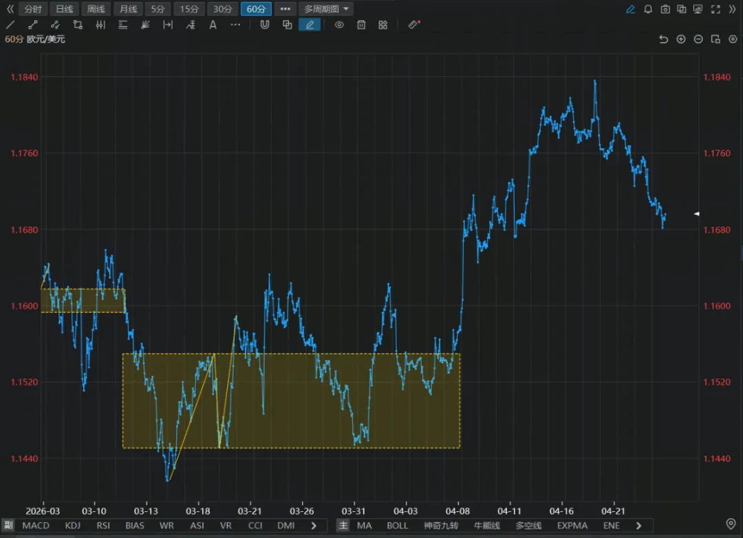 60分钟方向:上涨趋势中的回调阶段 ✅(从1.1440涨至1.1840,当前回调至1.1680附近)