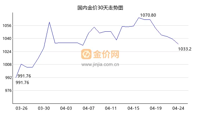 今日国内金价下跌,现价1030.65 元/克,下跌-0.87%,今日开盘价1039.50,最高价1044.34,最低价1029.00。