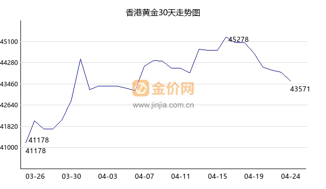 今日香港黄金下跌,现价43487 港币/两,今日开盘价43746,最高价43825,最低价43468。