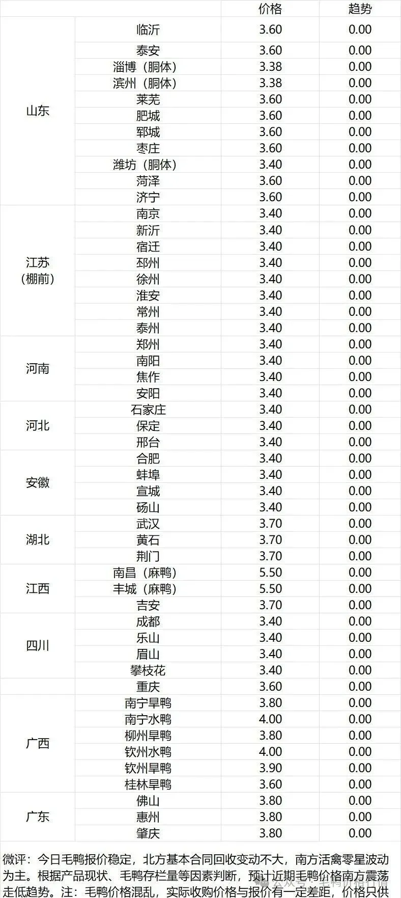 | 微评:鸭苗报价稳定。(注:南方只报当天价格)大厂控量保价,养殖端补栏情绪略有降温。根据产品、养殖成本及鸭苗现状分析,预计近期鸭苗价格呈震荡微调趋势。种蛋报价稳定。温馨提示:该价格为主流厂家报价,实际销售价格以成交价格为准,价格仅供参考。 |