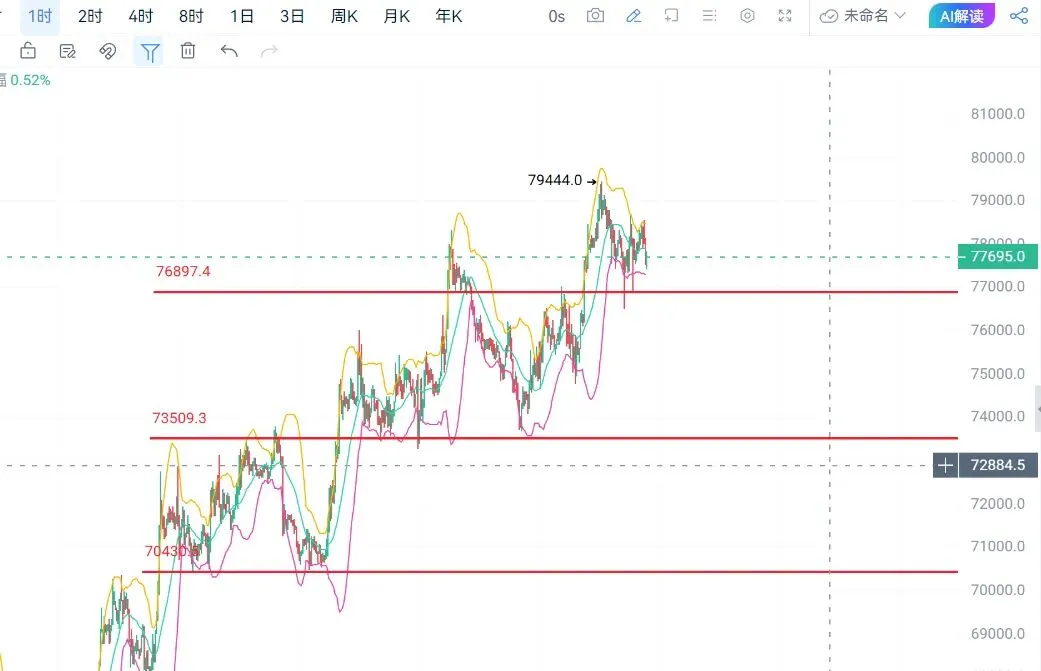 小时线低点一直在慢慢抬高,只要不跌破77483,下跌空间就打不开。