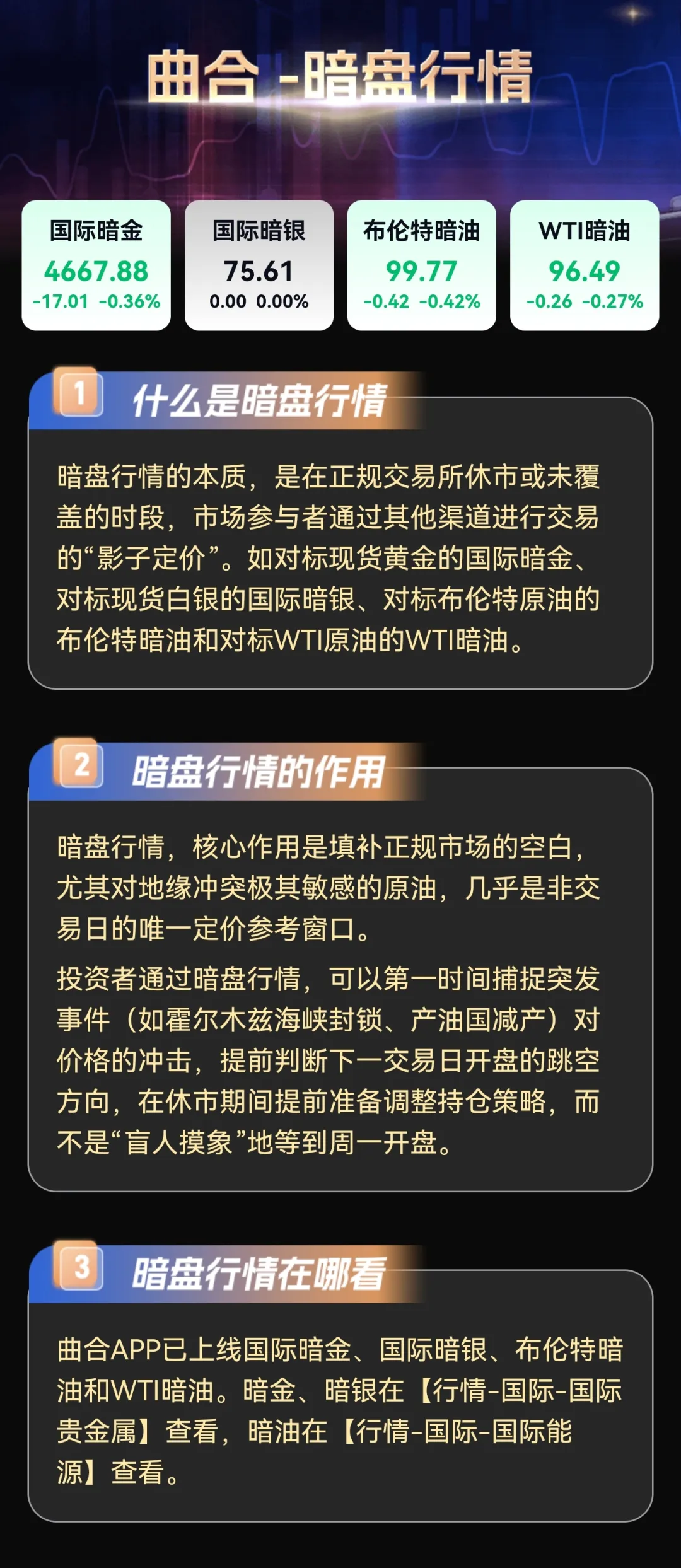 现在打开曲合APP,依次点击【行情-国际-国际贵金属】可查看暗金、暗银行情,点击【行情-国际-国际能源】可查看暗油行情。