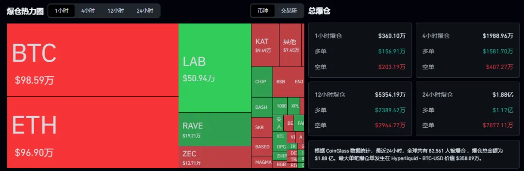 过去24小时全网共有85,521人被被爆仓,爆仓总金额为$1.88亿美元,多单爆仓1.17亿美元,空单爆仓7077.11万美元。📊 主流币表现: