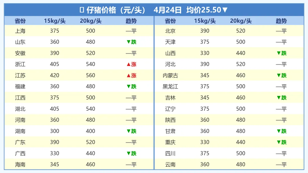 2026年4月24日 各省仔猪价格行情 | 数据来源:猪好多数据
