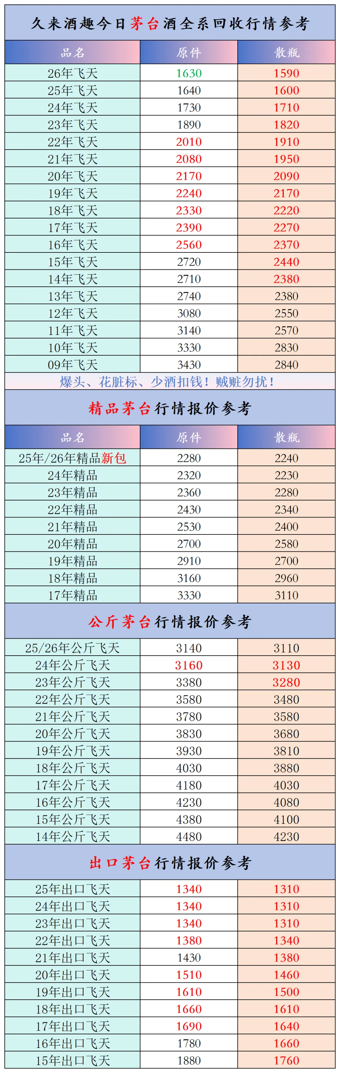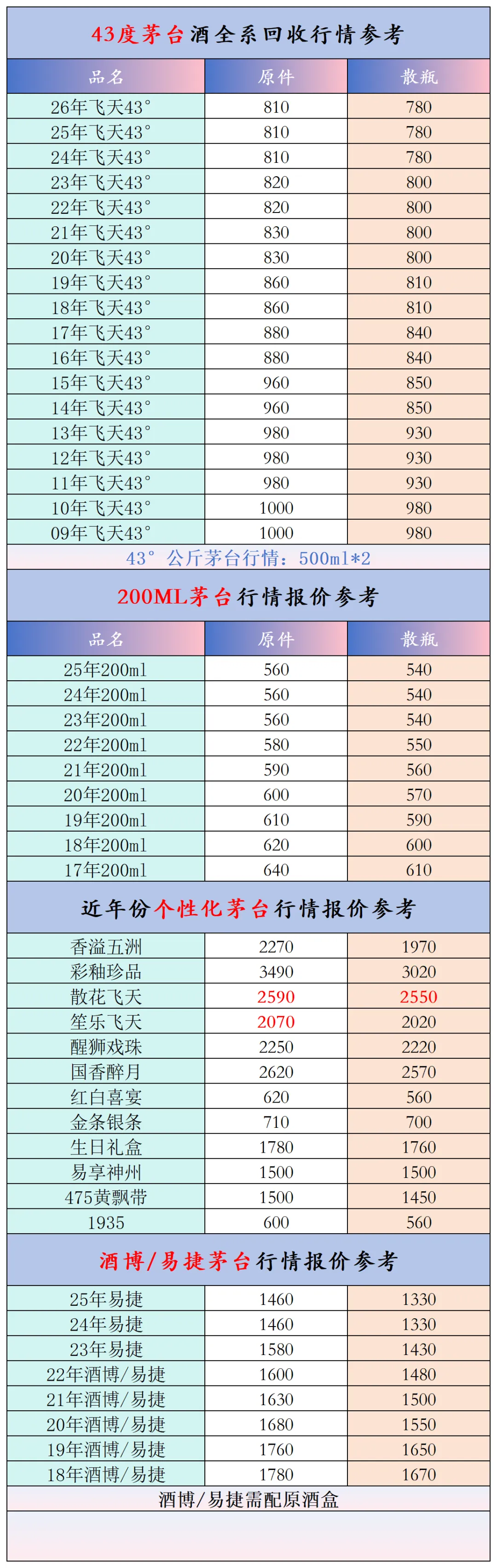 本公众号提供各种名酒回收行情报价,常规茅台、五粮液、洋河、剑南春、国缘等。所有报价根据市场买卖行情总结而来,每天更新最新报价!部分酒水每天涨跌幅较大,无法及时更新请谅解。本报价仅供参考,并非实际成交价格。感谢您的关注!我们会竭尽所能,提供更多更好的服务。