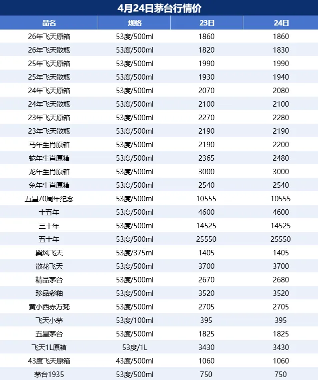 26.4.24日茅台行情价——飞天单瓶连续上涨