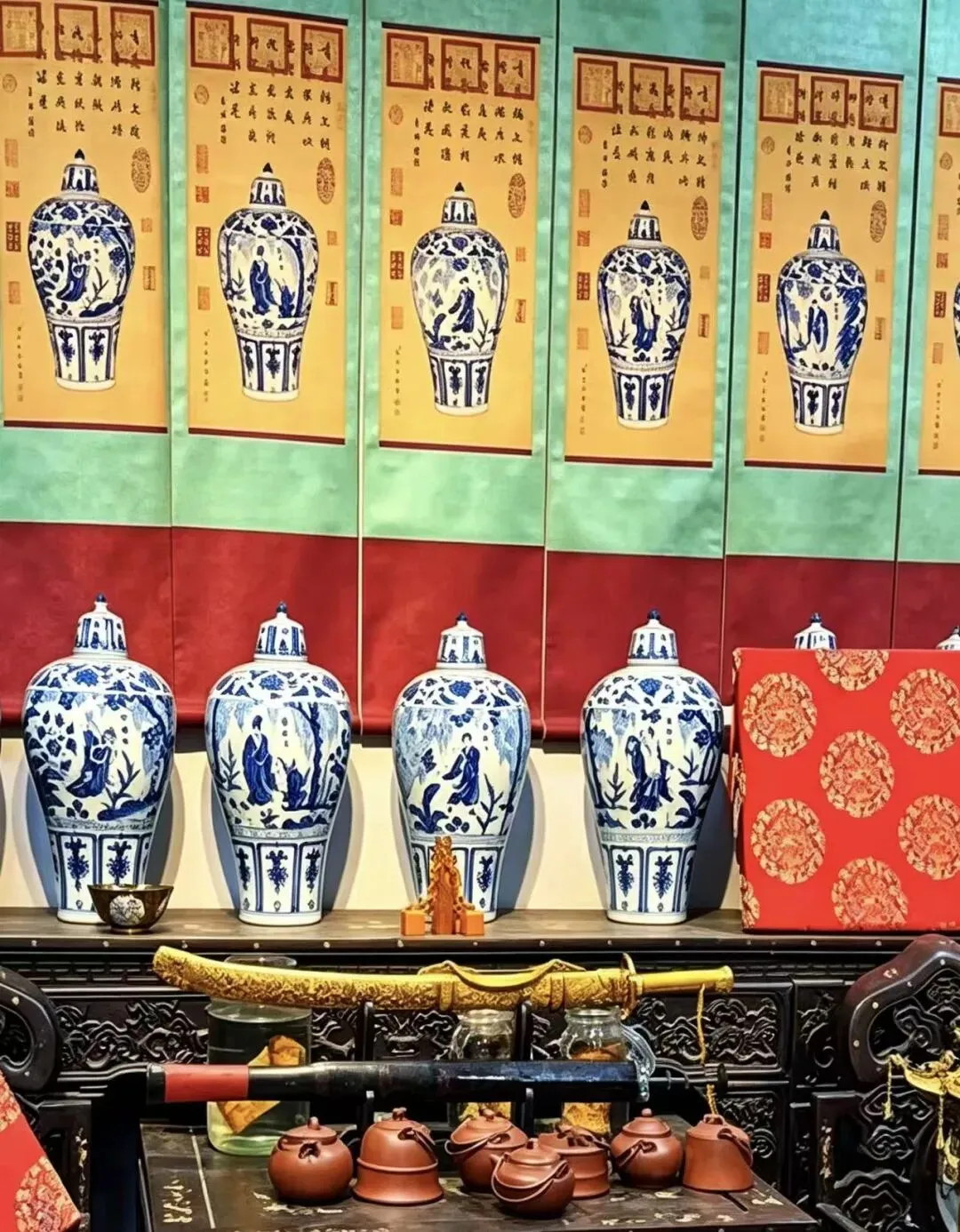 先看这一整排青花大瓶:器型规整、画工精细,配着对应的文献说明卡,这种成套的“主题藏品”,在行情起来后,溢价空间远不是单件能比的。现在入手这类有体系的藏品,等于提前占好了“稀缺性”的坑。