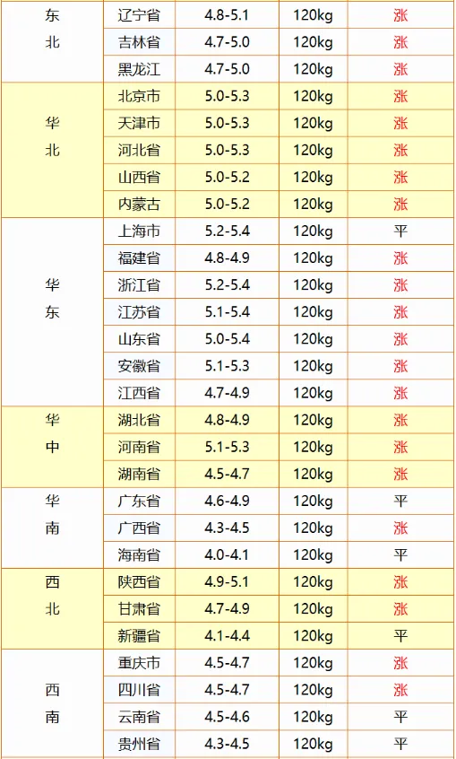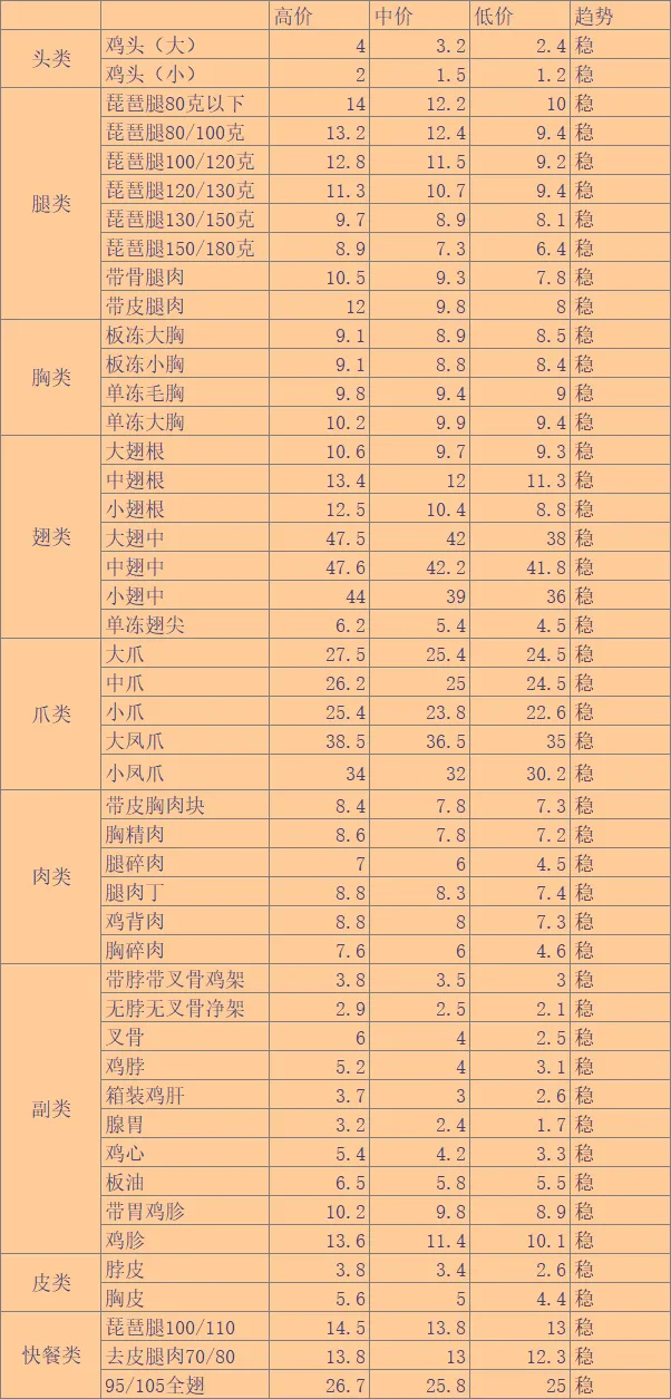| 微评:今日大肉食毛鸡报价稳定。近期鸡源仍有缺口,养殖端抗价惜售心态加重。而屠企受制于走货不畅,宰杀面临亏损,部分屠企有限杀休假操作。注:各地毛鸡以实际成交为准,其中活禽交易价格差异大。实际局部根据产品行情、消费、毛鸡出栏现状分析,实际收购价格与报价有一定差距,价格只供参考。 |