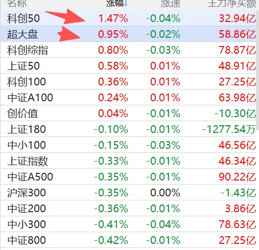 今日盘面分化极致,行情体验感极差。整体环境偏弱的背景下,资金却抱团发力超大盘权重股,天齐锂业、赣锋锂业、中芯国际、寒武纪、海光信息、贵州茅台、盐湖股份等大市值标的集体走强,超大盘指数单日上涨0.95%。权重虹吸效应下,中小盘个股全面承压,创成长、创业大盘指数走弱明显。