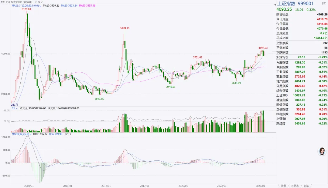 月线回踩跑道线,启动爆发概率极高,深成指、创业板90% 概率已开启超级大牛。上证指数进入主升浪第 6 个交易日,天地指标 1.16,与2007 年 3 月、7 月大牛走势高度重合。历史验证:指标高位调整后,均走出13% 以上涨幅,本轮短期至少看13%-15% 上涨。2. 核心指数目标与节奏