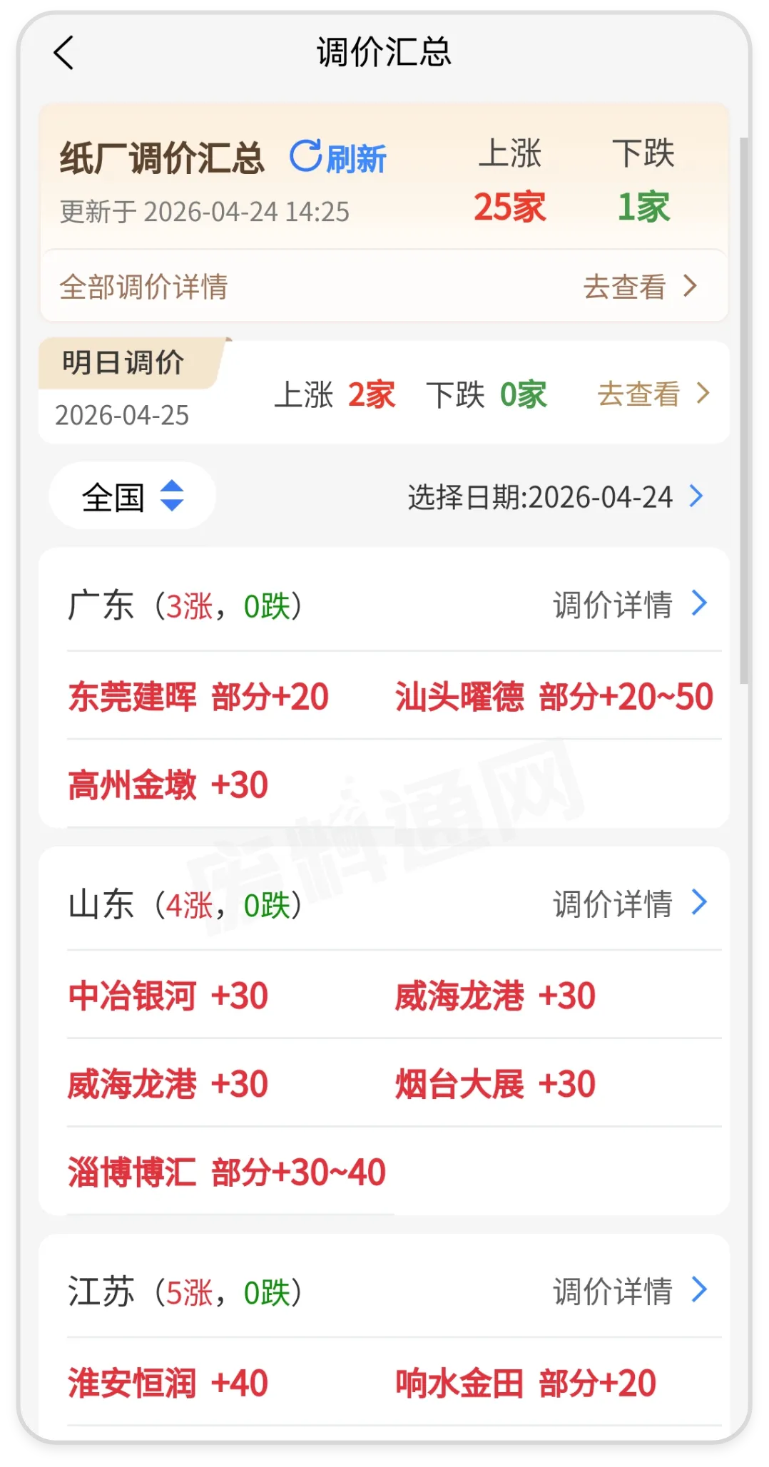 4月24日起,山东【银河瑞雪】纸业上调30,废纸执行到厂价格为:A级1640元、边角料1640、B级1540、C级1510元、D级1450元、E级1290元。特此声明:质量要求必须分捡过手严禁恶意掺杂使假,严禁夹包、如有发现降级、加重扣点、罚没。废纸价格涨30元/吨,请广大客户保证质量,要求纯干货,望积极送货4月24日起,山东【威海龙港】纸业,废纸价格上调30元/吨。调整后执行价格:AA1620元,A1级1570,A1520元,B1450元,C1400元,D1350元。
