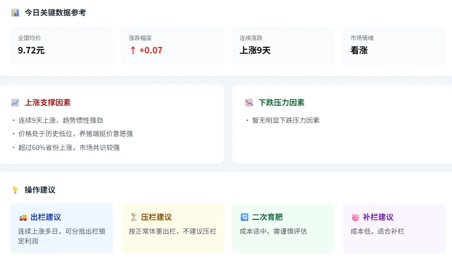 🔗 产销价差分析:猪肉(16.35) - 生猪(9.72) = 6.64元(价差率68.3%)。价差率较高,屠宰利润丰厚,但终端消费承压,需警惕价格回调风险。