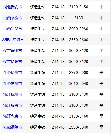 4月24日华北地区铸造 生铁价格稳,Z18武安3150元/吨,临汾3130元/吨。4月24日华东市场炼钢 生铁报价稳,主流报价2700-2920元/吨,现款含税,一单一议。4月24日华北地区炼钢 生铁报价稳,唐山2660元/吨,武安2660元/吨,临汾2830元/吨。4月24日华中市场铸造 生铁价格稳,Z18林州2980,黄石2930,郴州2800,现款含税。(元/吨)4月24日东北铸造 生铁报价稳,鞍山、辽阳等地Z18报价3100元/吨,现款含税。4月24日西南铸造 生铁价格稳,Z18报2880-3150元/吨,现款含税。4月24日西北铸造 生铁价格稳,Z18乌海2650新疆2800甘肃2800包头2700,现款含税(元/吨)。4月24日华中地区炼钢 生铁价格稳,安阳2630元/吨,大冶2560元/吨,现款含税。4月24日西北炼钢 生铁报价稳,乌海2500宁夏2500包头2500甘肃2650,现款含税。(元/吨)4月24日华南铸造 生铁价格稳,Z18广西3000,高州3040,阳江3040,现金含税。(单位:元/吨)4月24日华南地区炼钢 生铁价格稳,广东地区L8-L10报2600元/吨,现款含税。扫码加入生铁废钢交易群想要了解更多价格行情,就上铸材行情