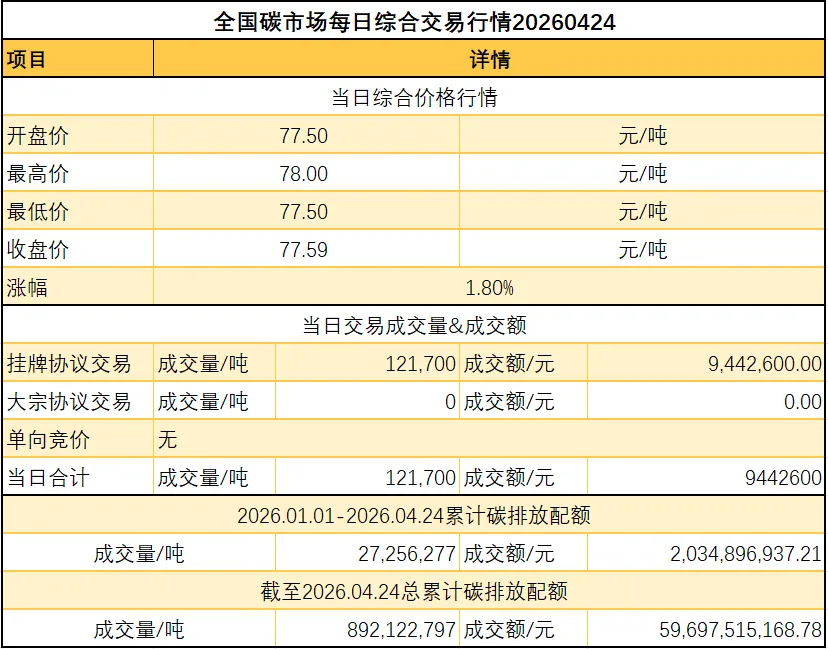>【CEA】全国碳市场每日综合价格行情及成交信息20260424