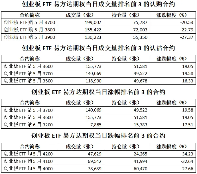 创业板ETF易方达期权总成交面额668.49亿元,增加4.60%,期现成交比为0.20,权利金成交额17.08亿元;期权总成交量1,836,249张,增加5.61%,其中认购期权成交量953,951张,认沽期权成交量882,298张,认沽认购成交比率为0.92(上一交易日认沽认购成交比率为0.81)。