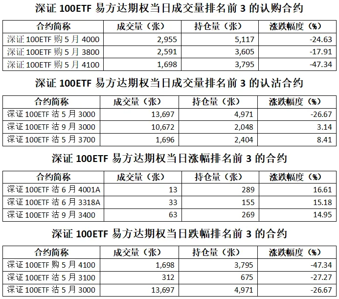 深证100ETF易方达期权总成交面额15.98亿元,减少22.00%,期现成交比为0.00,权利金成交额0.19亿元;期权总成交量47,218张,减少20.99%,其中认购期权成交量14,679张,认沽期权成交量32,539张,认沽认购成交比率为2.22(上一交易日认沽认购成交比率为2.21)。