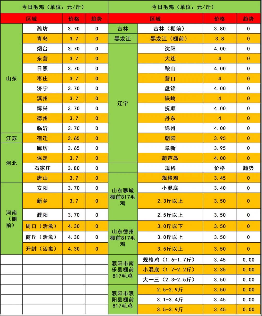 注:各地毛鸡以实际成交为准,其中活禽交易价格差异大。实际局部根据产品行情、消费、毛鸡出栏现状分析,实际收购价格与报价有一定差距,价格只供参考。