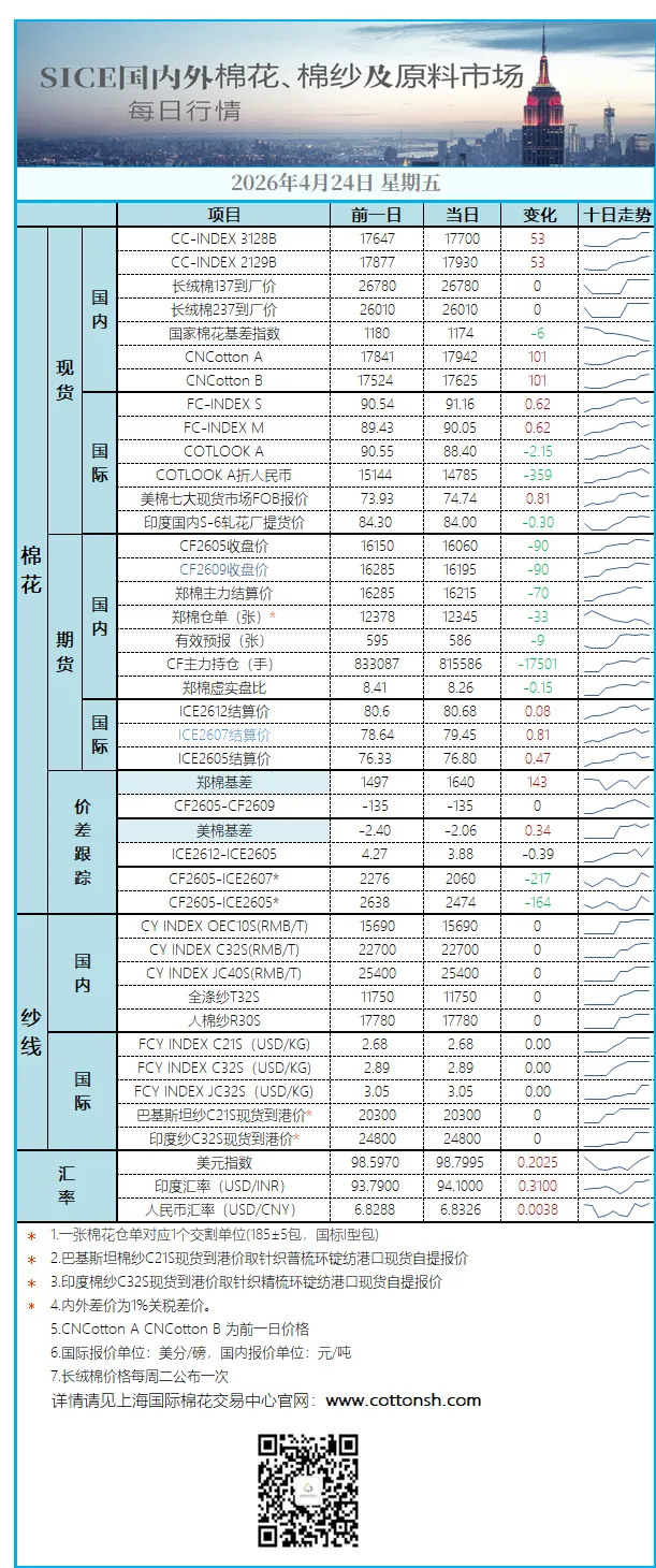 5.4月24日,中国主港报价小幅上涨。国际棉花价格指数(SM)90.06美分/磅,涨0.79美分/磅,折一般贸易港口提货价15262元/吨(按1%关税计算,汇率按中国银行中间价计算,下同);国际棉花价格指数(M)88.18美分/磅,涨0.80美分/磅,折一般贸易港口提货价14948元/吨。