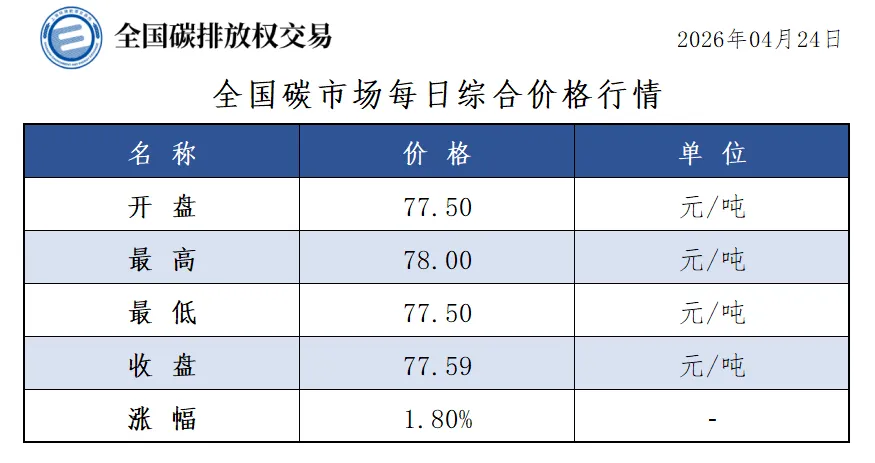 今日全国碳市场综合价格行情为: 开盘价77.50元/吨,最高价78.00元/吨,最低价77.50元/吨,收盘价77.59元/吨,收盘价较前一日上涨1.80%。
