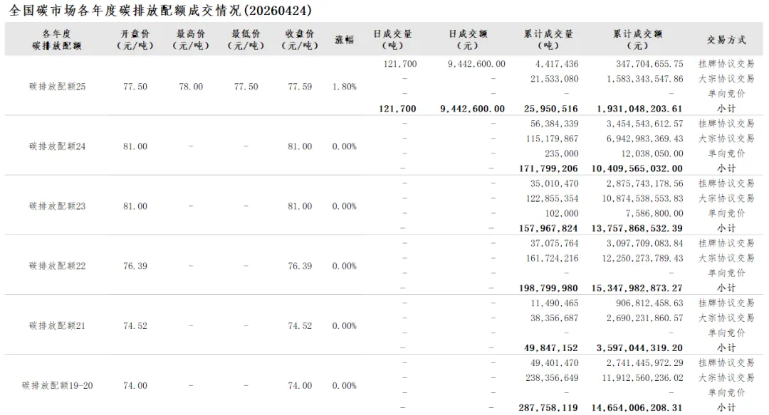 2026年1月1日至4月24日,全国碳市场碳排放配额成交量27,256,277吨,成交额2,034,896,937.21元。