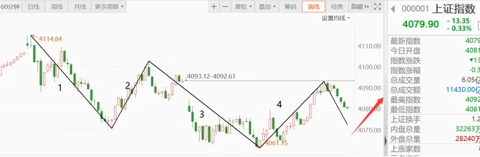 (1)5分钟沪指当下是构造中枢,因此表现就是震荡,4浪反弹较为强势,因此如果5浪下跌不跌破4061点,则会继续反弹。