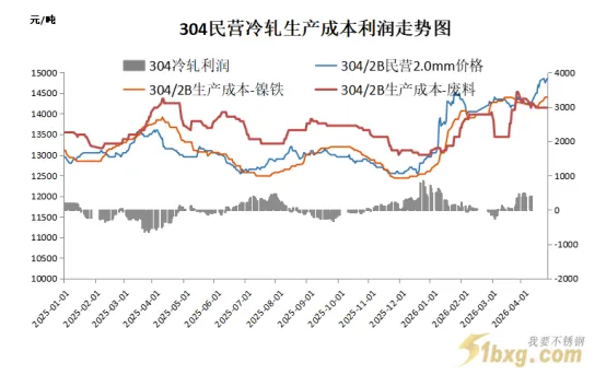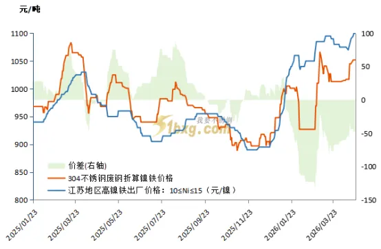 印尼4月15日落地镍矿HPM公式修订,抬升镍矿价格中枢,高镍铁市场议价集中在1100-1150元/镍,成本端底部支撑强劲。按照4月24日戴南主流304一级料价格采购价10200元/吨计算,该价格折合单镍点价格约1052元/镍,较江苏地区高镍铁出厂价1105元/镍,低53元/镍,废料与镍铁价差倒挂,废料价格更具经济性,钢厂采购意愿良好。
