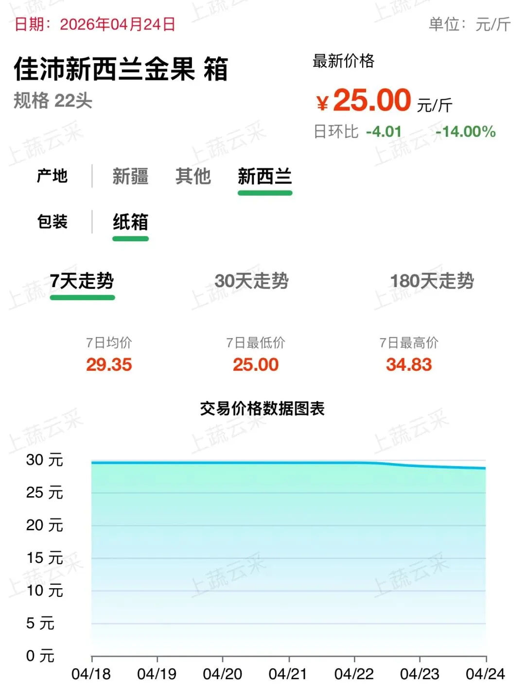 佳沛新西兰金果大量上市,目前市场上,“22头”规格(即每箱装有22个果实)的佳沛金果,批发参考价为175元/箱;“25头”、“30头”规格的佳沛金果,批发参考价为170元/箱。(每箱约为6.6斤)