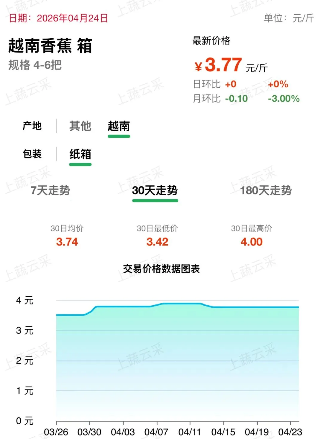 越南香蕉(13.5公斤/箱,约3-4把)价格约为95元/箱;