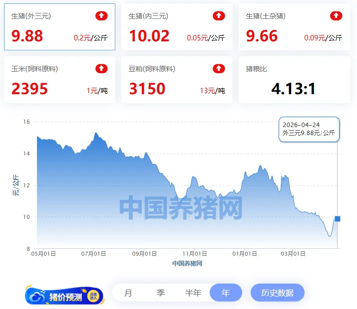 2026年4月24日全国外三元均价9.88元/公斤,今日猪价较昨日报价上涨了0.2元/公斤。