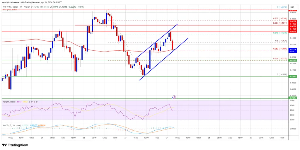 - XRP/USD 小时图上正在形成上升通道,支撑位在 1.430 美元(数据来源:Kraken)。