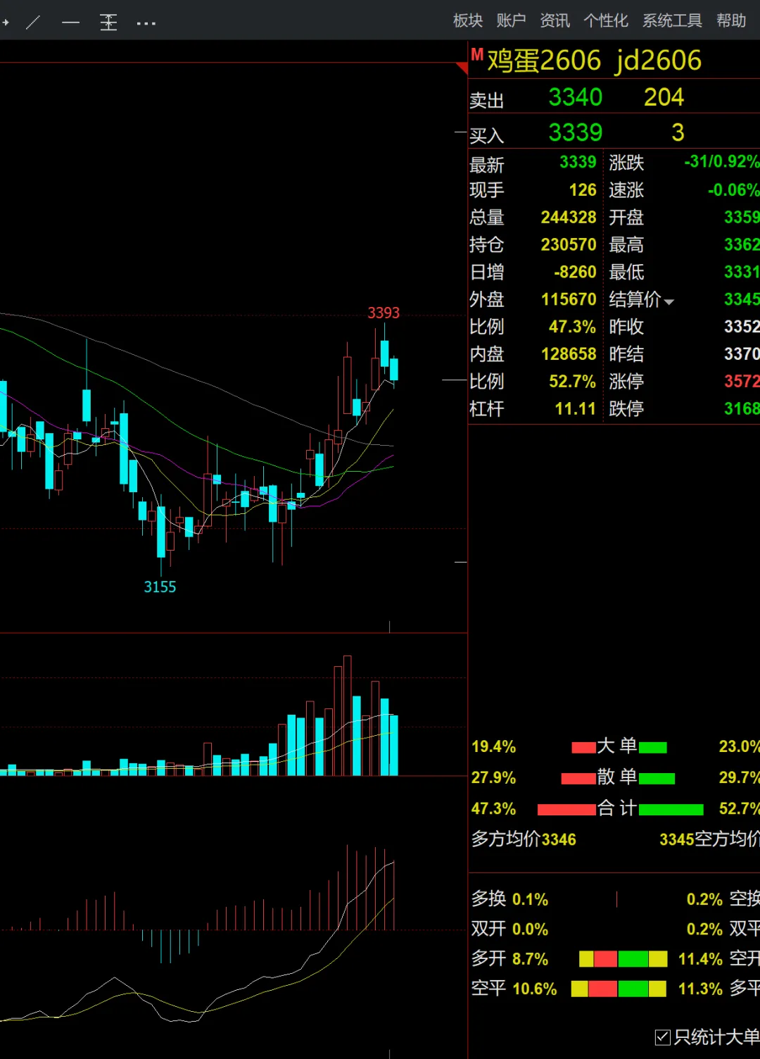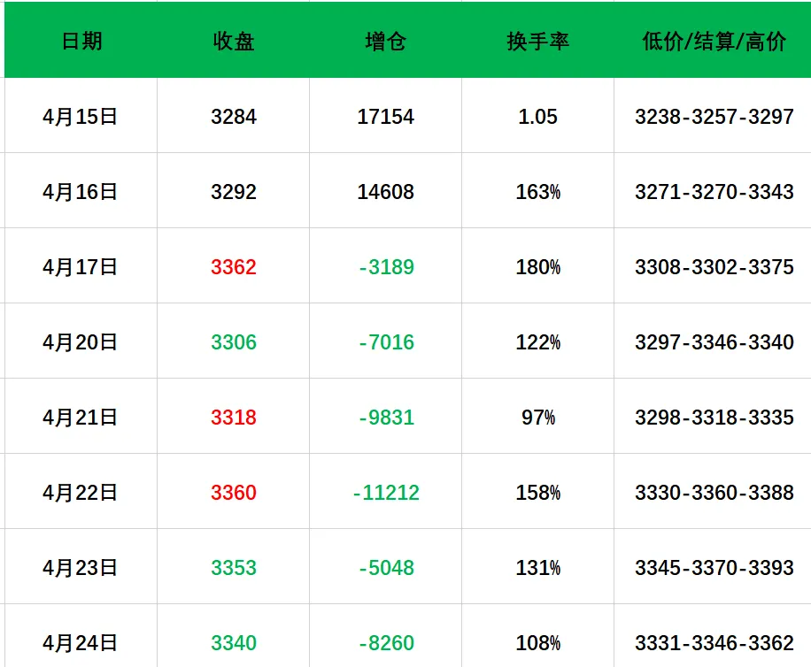 开盘3330,最高3388,最低3330,结算3360。增仓-11212手+41点,