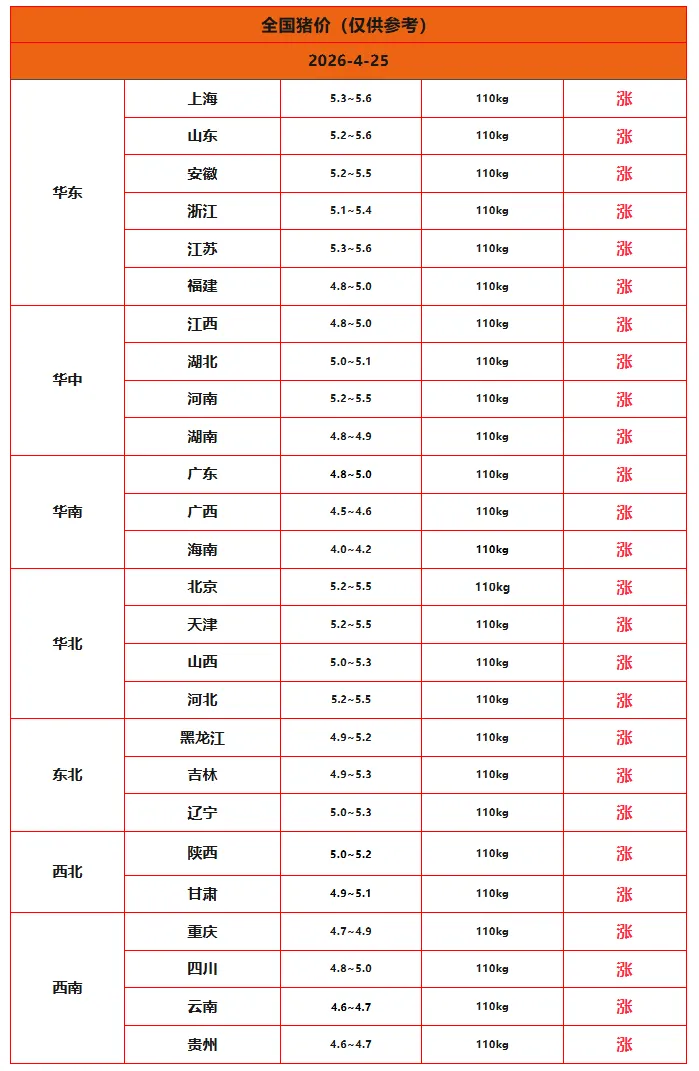 2026年04月25日全国猪价行情表