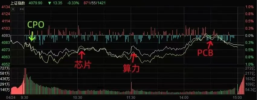 今日沪深两市成交2.64万亿,成交量较上一交易日缩量1626亿。两市实际上涨1995家,实际下跌3085家,实际涨停59家,实际跌停20家。主流资金今日净卖出574.03亿元,下图是今日资金进攻的板块路径今日市场全天呈现探底后震荡回升修复行情,三大指数均跌破5日均线,而科创50指数得益于国产算力和半导体产业链强势,最终仍逆势涨超1%。虽然今日指数整体跌幅相对有限,但仍有超3300股下跌,非ST跌停股家数增至近20只,随着上市公司业绩披露进入最后一周,业绩表现对于个股二级市场表现形成持续影响,因此对于一些尚未发布年报和一季报的高位题材股,短线补跌风险仍应重视。而从指数方面看,虽然沪指尚未跌破60日均线,但从60分钟K线来看,沪指MACD和KDJ已经处于双死叉,这一状态短线能否得以扭转,才是指数确认重新转强信号。上证周线走势结构:周线还是一笔上,这个周线一笔,前面这一笔是由四根k线构成的,现在这个已经打破了前面的逻辑,现在是第五根k线了,看下周是否形成顶分,看能不能形成一根向上的周线笔的结束。当然出现顶分也不代表着一定结束,也可能是一个调整中继。当然后面的几周会围绕它进行波动的机会在加大,而且从量价看,这三周的上涨量是在不断增加的,随着上涨,分歧在逐渐加大。目前来看,周线至少现在没有顶分,还可以继续观察。
