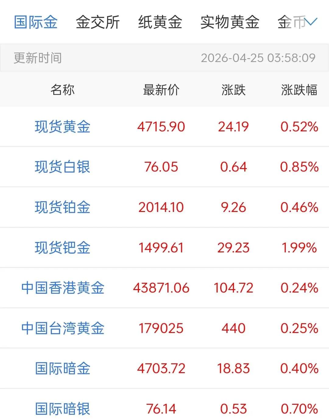 国际现货黄金直接冲至4715.90,日内大涨24.19,涨幅0.52%,多头势头根本压不住!现货白银、铂金同步跟涨,而现货钯金更是直接炸出1.99%的涨幅,领涨整个贵金属板块。