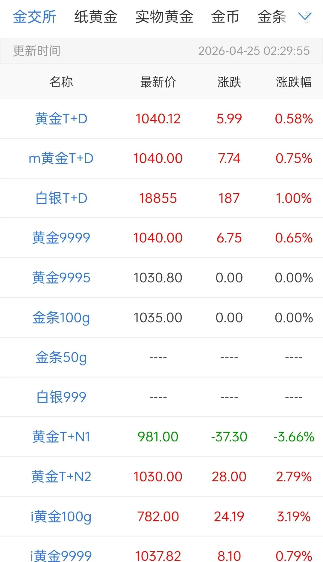 黄金T+D:1040.12元/克,上涨5.99元,涨幅0.58%,