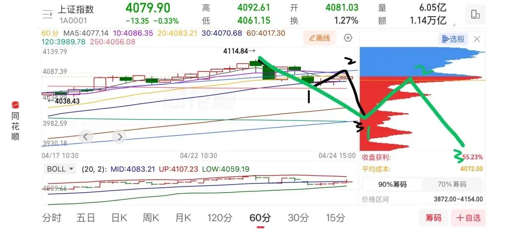 上周五指数跌破了60分钟的上升通道,下午反弹的最高点正好是上升通道上沿线上,也可以叫跌破之后的反抽确认,只要上面那条线突破不了,指数就会向下寻求支撑,也就是上升通道的下沿线。