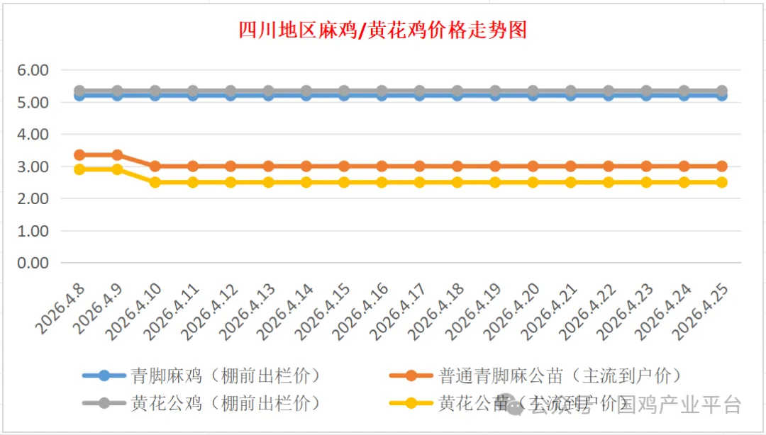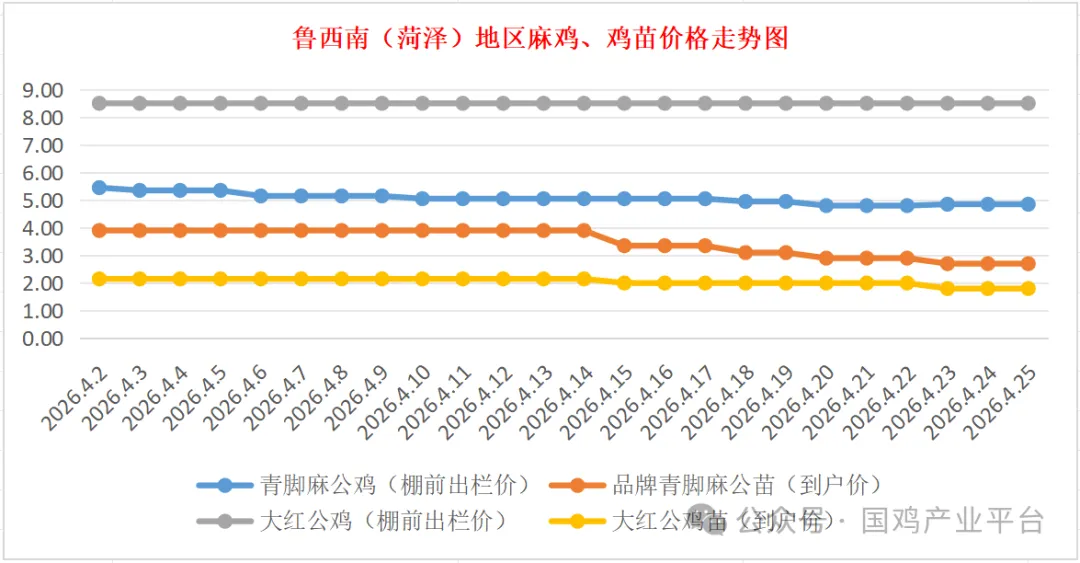 品牌青脚麻公苗(多品种快大型):价格稳定,到户价4.20元/羽,稳。