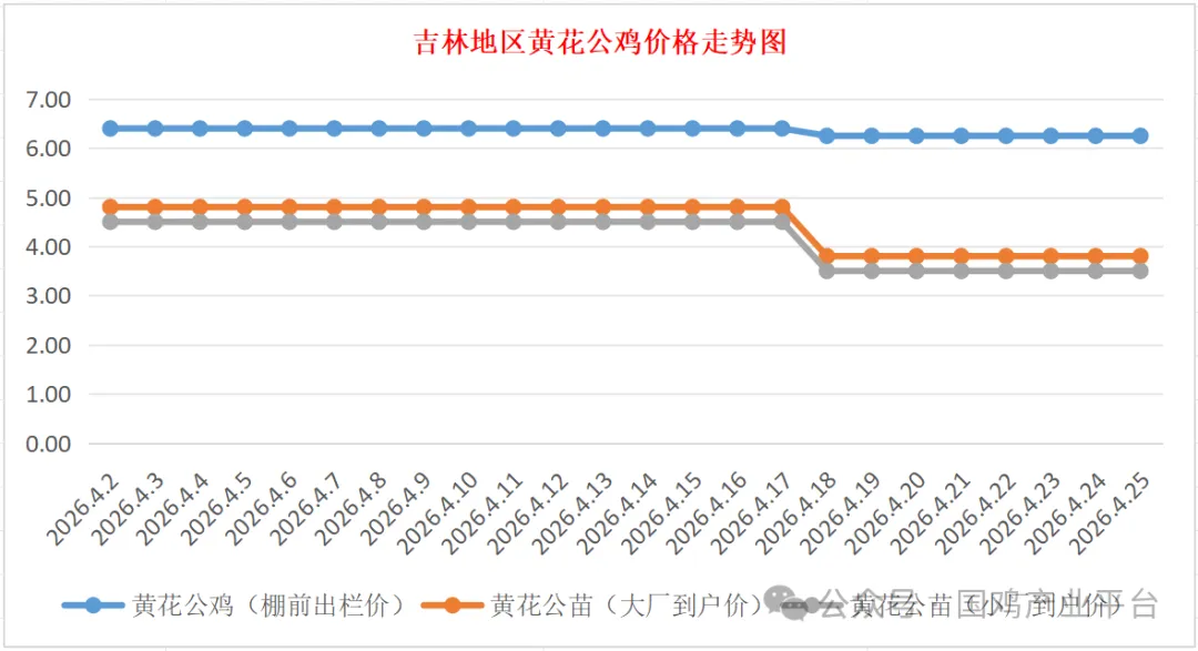 黄花公苗:价格稳定,大厂到户价3.80元/羽,小厂到户价3.50元/羽,稳。
