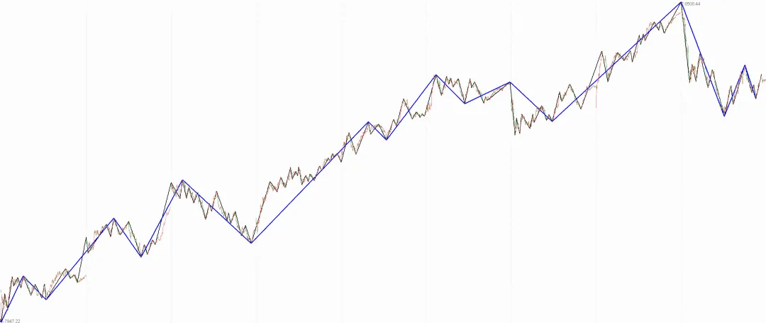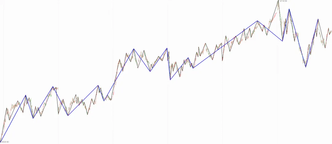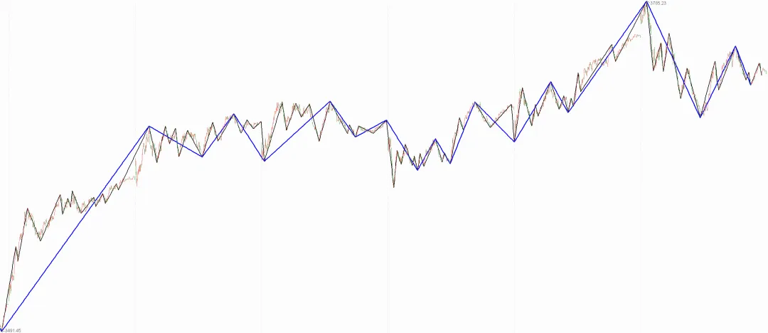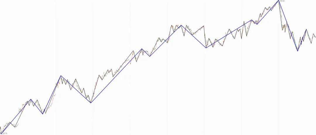 以笔段划分作为1分钟走势底层高低点A0,目的在于打破递归公式的嵌套,以线段方式衡量底层多空有效性更稳定,在线段划分时,缠师前期给出的线段标号是凭借对多空力度变化的经验判断,以线段破坏线段为标准,划分有一定的经验性,不容易被掌握,后期给出以特征序列为标准的划分方式,标准更加明确可量化,因此,我们线段划分的主要方式就是基于特征序列的划分方法,缠中狩猎工具包也是严格按照特征序列标准实现的。