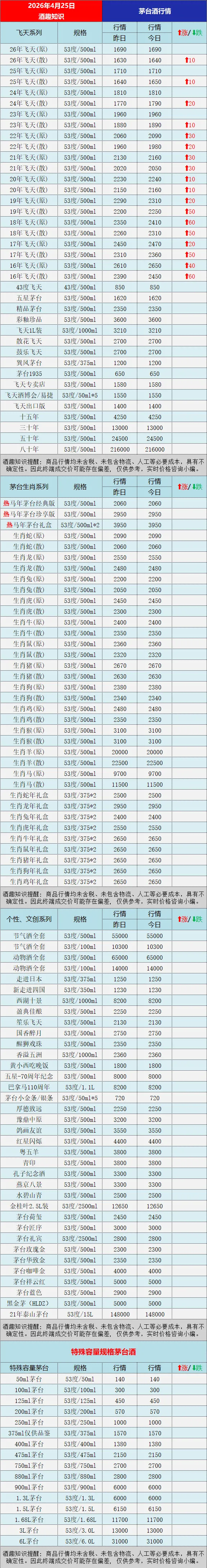 今日茅台酒行情价格参考:飞天系列,2016-2026年飞天原箱以及部分散瓶再度大幅上涨。更多茅台系列酒具体行情参考下文图表:《酒趣知识》温馨提醒:商品信息均未含税、未包含物流、人工等必要成本,具有不确定性。因此终端成交价可能存在偏差, 仅供参考,实时价格咨询小编。注意:茅台等品牌老酒价格小幅波动频繁,老酒受品相克重影响价格差异大,同时不同地区价格有几十元不等的差价,最终以实际成交价格为准!《酒趣知识》多媒体平台同步给您带来茅台酒及时行情参考,同步深挖茅台、五粮液、汾酒等各大名酒资讯,为酒友奉上客观的价格参考与专业的行业解读,让大家用酒有价可依、避坑无忧。丨声明:部分图文来源于网络,版权归原作者所有,如涉及版权等问题,请及时与小编联系删除或修改。