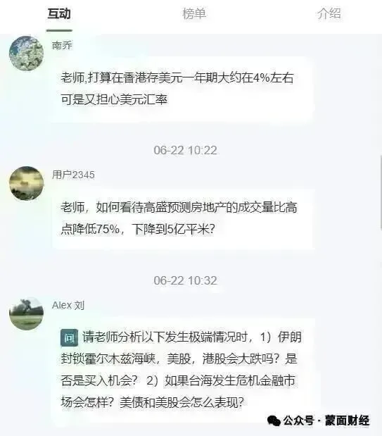 直播间与蒙面侠互动,享受会员专属提问权,耐心解答您的疑惑,听取财经大V观点。