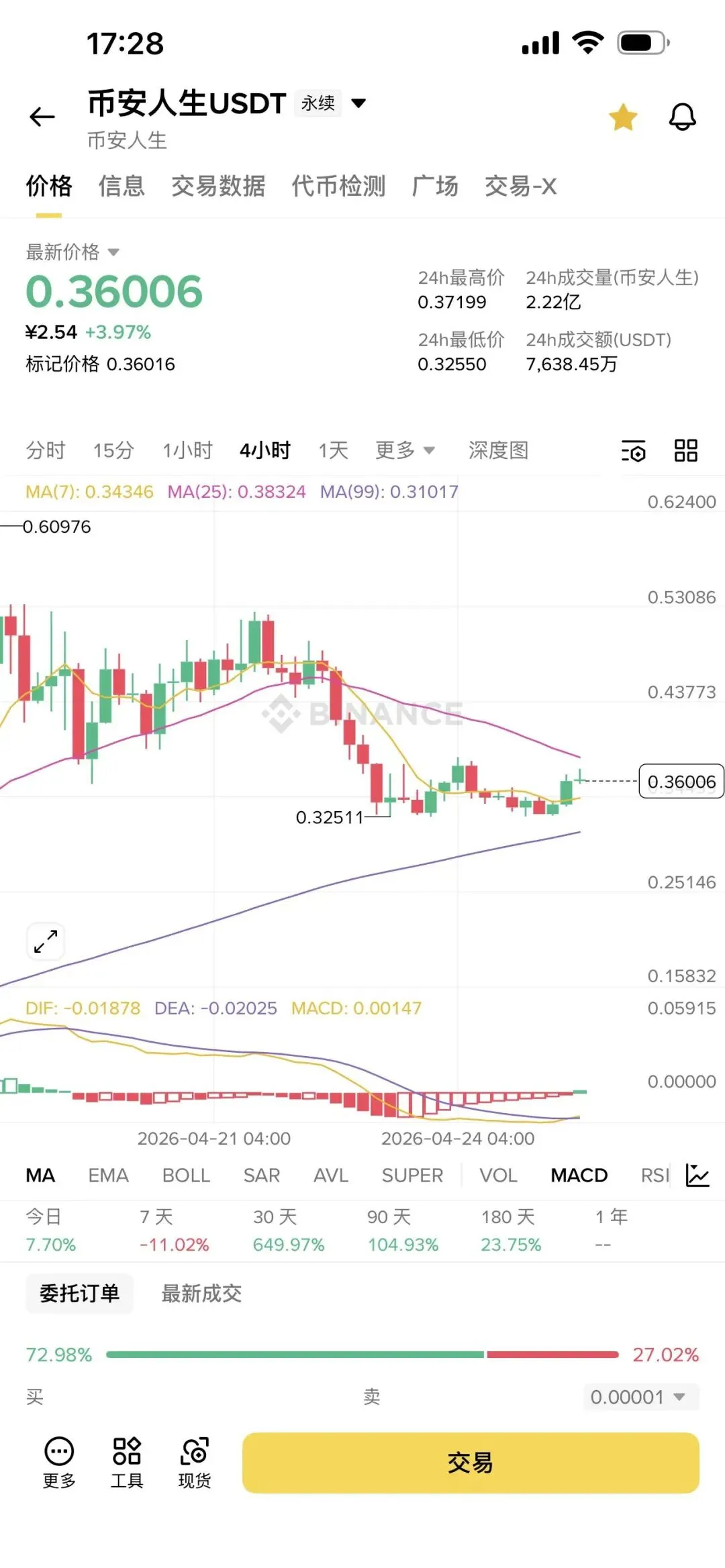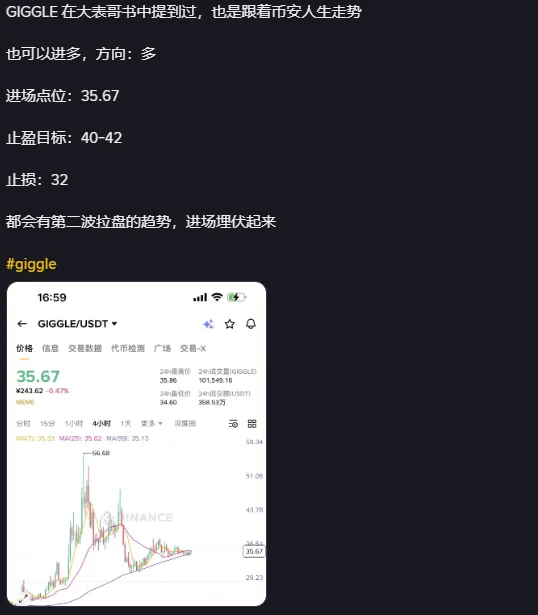 2:人生 大概率 okx和 cb 他们不会支持了,但 恰恰他们不支持,bn更会把币安人生做好 ,你可以把币安人生 当成 小bnb 看待,间接相当于承接了 bn 和 bsc 的基本面 指标 和未来预期,其实你会发现,现在 fud 人生 基本= fud bn ,看不爽bn的 ,很多都在diss人生 甚至做空;人生是真的不缺空军,其他币只有羡慕,没办法,人生这个meme本身也是天然利用了币圈对bn感观的冲突性3:人生现在才 4亿多市值, 而且不缺空军,真的不缺,我觉得bn 或者说 bn系资本 完全可以把 人生继续做大, 资金层面也不难,bn 这么大,它已经是一个体系了, 有很多嫡系资本的,只要 cz他们给个暗示, 资本坐庄 人生 也有利可图, 时不时 cz就会奶一下人生 ,甚至把 币安人生 做成文化, 把老徐diss人生 做成meme梗的一部分4:人生做大,对于bn系资本(庄家) 对于bn,对于bsc长期性,对于整个中文meme继续玩下去 ,都有意义;这对于bn系来说是多赢、赢麻局面;对于“非bn系”来说 肯定是 巨大的不爽。。但 恰好让敌人越不爽的事,往往就是做对了;再结合bn、cz他们对”人生”投入的资源和流量,给我的感觉是他们也挺重视人生这个标币安人生可在0.36点位埋伏进去,还会有第二波拉升行情,止盈可设置在0.45-0.5,止损设置在0.3,控制号仓位。首先gg市值已经很低了,前高也有300M ,现在只有3000多万了(Ps. 你一个标的再好,你追在高位 也一样亏钱,储存再牛逼 ewy再牛逼你追高也赚不到, 现在gg 我觉得被低估了,算是一个值得考虑的价值洼地标的),而且gg 也有个独特性,代表了 cz的长期慈善事业 ,meme和慈善绑定本身就非常好,另外 和人生同期上了现货的meme,只有gg 一个,4 只上了合约,后面的bsc meme也都是只上了合约