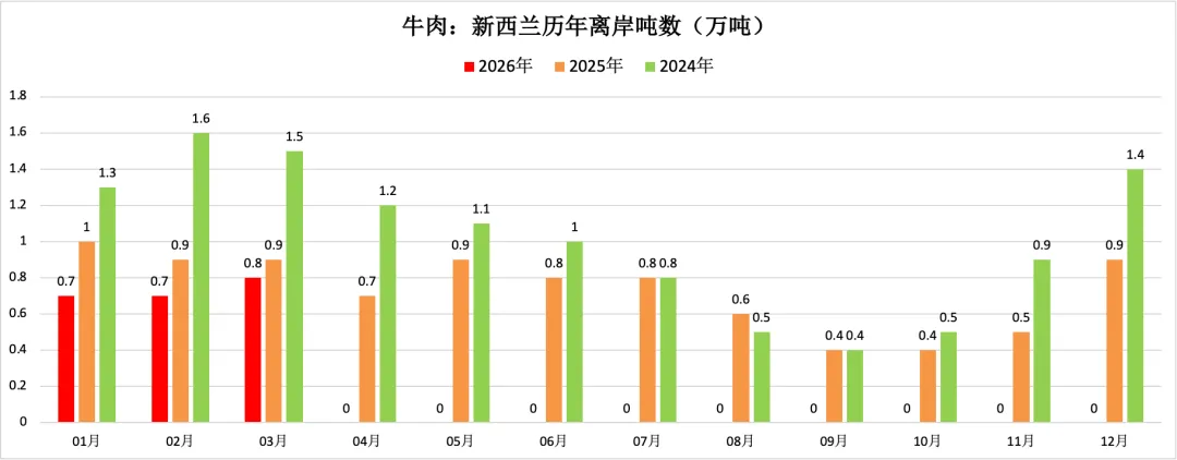 3月数据,新西兰出口牛肉到中国8000吨,比去年2月9000吨少11%。前三个月出口中国2.1万吨,比2025年同期2.8万吨减少了0.7万吨,减少25%。按这个数量预计,今年新西兰20万吨能用大概7万吨的样子,配额多13万吨。