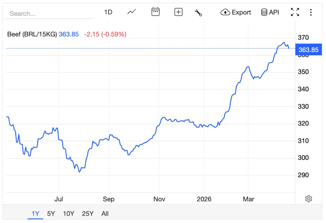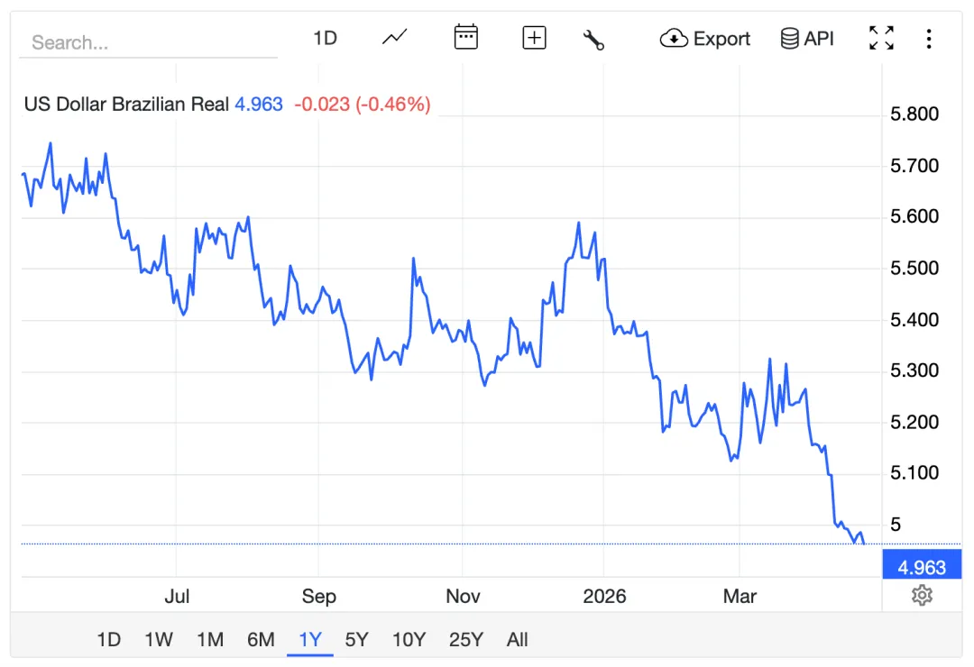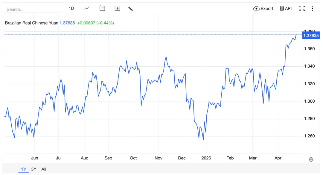 美元对比巴西货币,持续贬值。人民币对巴西货币,也持续贬值。继续拉高出口价格。