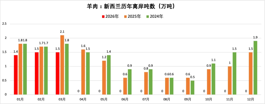 3月数据,新西兰出口羊肉到中国1.5万吨,比去年3月2.1万吨少29%。前三个月出口中国4.3万吨,比2025年同期5.7万吨减少1.4万吨,跌幅25%。