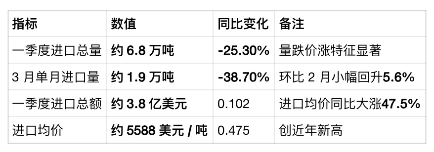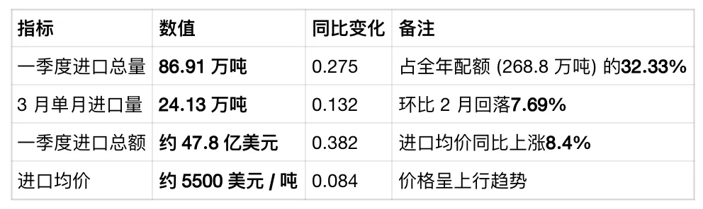 美国份额骤降:受配额限制与本土价格上涨影响,对华出口几乎停滞,仅占 0.2%。今年16万吨配额危险。