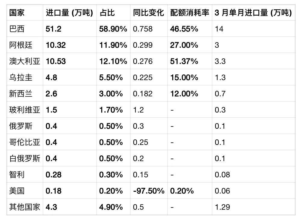 澳大利亚配额消耗最快:虽进口量不及巴西,但配额消耗率高达 51.37%,居各国之首