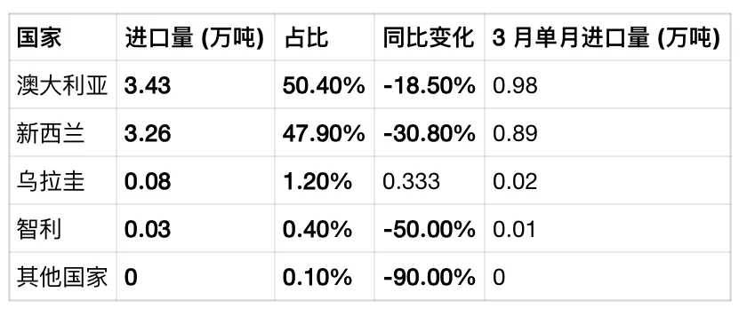 截止4月20日,澳洲出口到中国5000多吨,预计4月出口8000吨左右,比3月减少1800吨,前4个月预计3.4万吨,比去年同期5.1万吨,会减少33%。