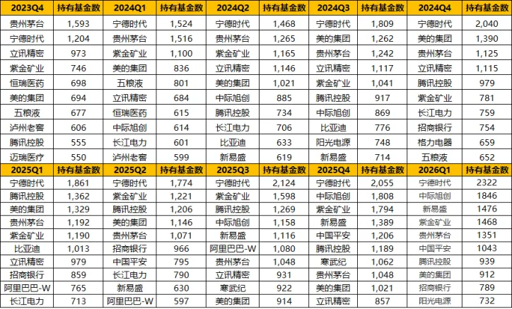 小二统计了2023年四季度至今每一次公募基金的重仓股排名,从基金持有数来看,以前大消费范畴能占到7席,现在只能占3席到4席,取而代之的是科技产业链公司的上位。
